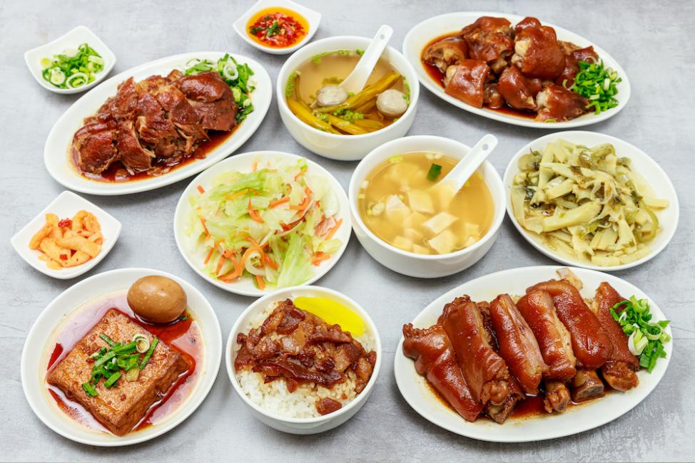 台灣的飯類小吃豐富多樣,滷肉飯以香氣撲鼻的滷汁浸潤著軟嫩米飯,綿密的五花肉丁令人垂涎。焢肉飯則是將五花肉切大塊,用醬油、酒,加入冰糖、蔥蒜及香料,煮滾後放入肉塊,以小火滷煮至熟透。